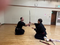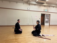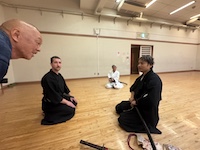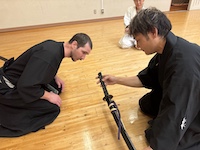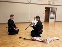 本日、貝塚支部は賑やかです。亜米利加からお客様が見学希望とのことでお越しになりました。なんでも愛洲氏顕彰で興味を持っていただいたとのこと。 別流派の居合を学ばれているとの事で交流の為見せて頂きました。当流派とは異なり迫力とキレのある力強い見事な演武でした。我々ももっと励まなければと・・・。そのあと貝塚支部の”必殺さん”と”筆頭さん”を交えて刀交流をしておりました。美は日本だけでなく、海外でも通じるのですね。そう言えば今週日曜日も見学にお越しになるとの事でした。当会では、いつでも見学におこしください。見学をご希望の方は音合い合わせの欄からメールを頂けると助かります。都合により急に練習がなくなることがありますので。